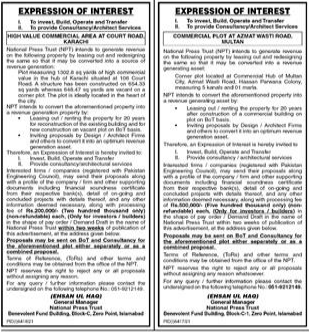 Interested Firms / Companies may send their proposals along with profile of the company / firm and other supporting documents including financial soundness certificate from their respective bank(s), detail of projects carried out in the past and in hand, etc. along with processing fee of Rs. 10,000/- (Ten thousand only) (non-refundable) for each (Only for investors/builders) in the shape of pay order / Demand Draft in the name of National Press Trust.