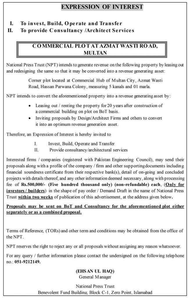 Interested Firms / Companies may send their proposals along with profile of the company / firm and other supporting documents including financial soundness certificate from their respective bank(s), detail of projects carried out in the past and in hand, etc. along with processing fee of Rs. 10,000/- (Ten thousand only) (Non-refundable) (Only for investors/builders) in the shape of pay order / Demand Draft in the name of National Press Trust.